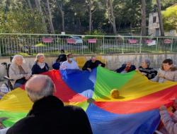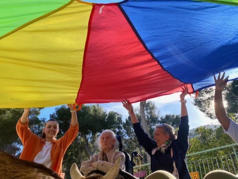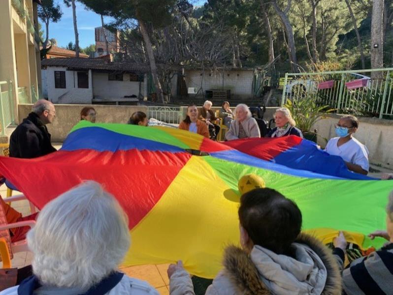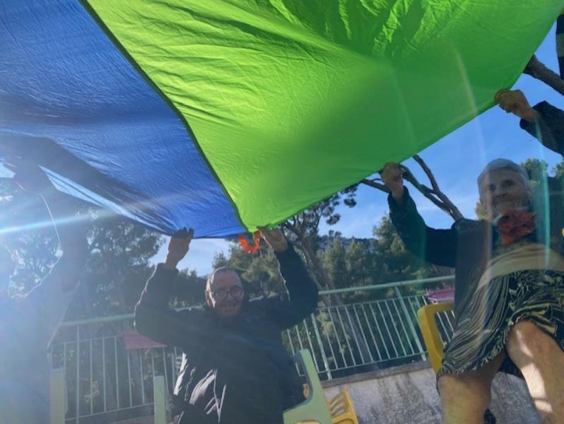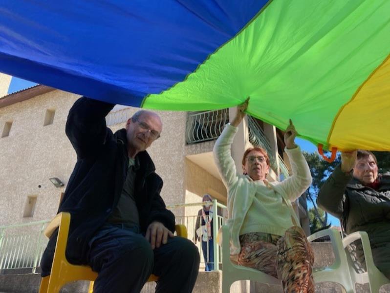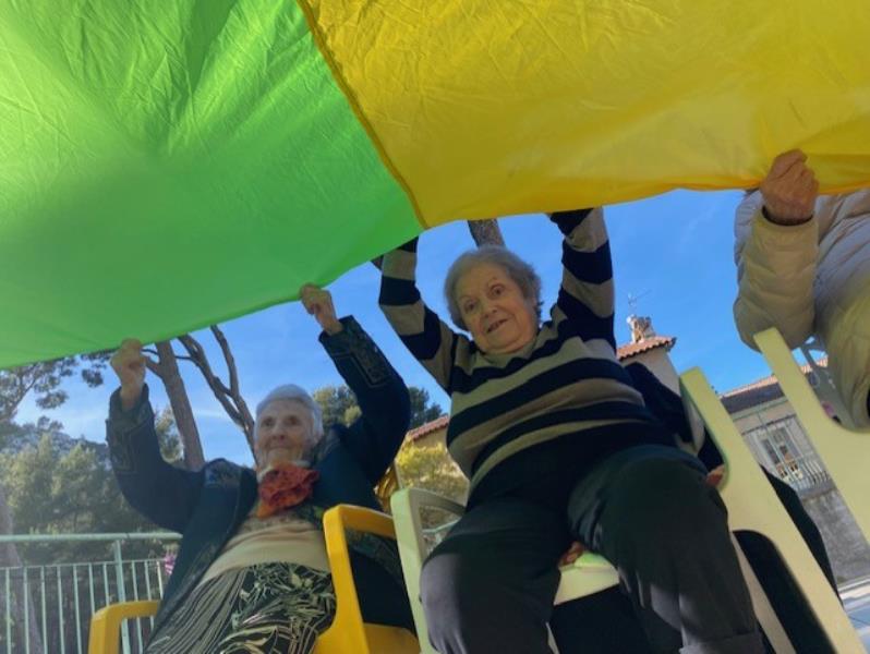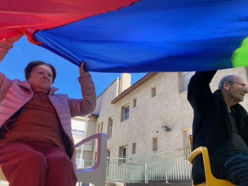 Mardi après-midi, sous un soleil parfaitement au rendez-vous (et manifestement très investi), les résidents ont participé à un atelier de coordination autour d’une grande toile collective.