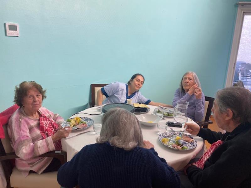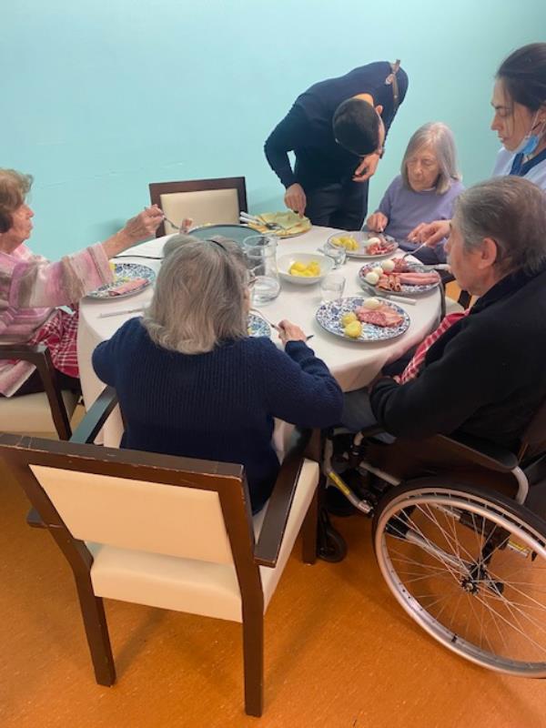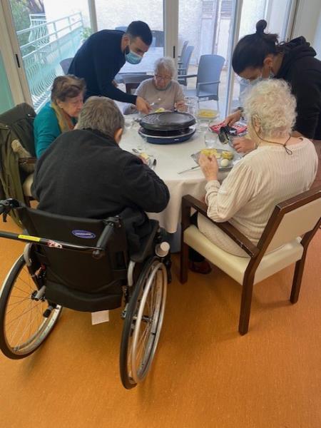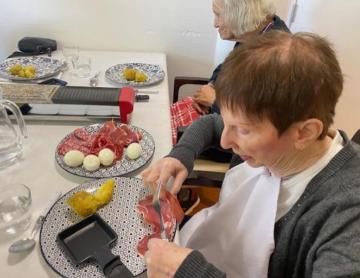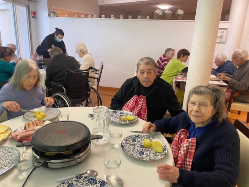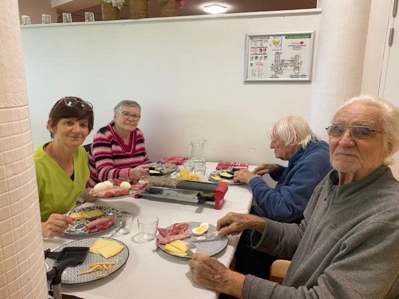 Résidents et personnel continuent de partager ce moment convivial autour de la table, entre éclats de rire et assiettes bien garnies. Certains deviennent déjà de vrais experts en raclette… et les plus gourmands tiennent bon la cadence !