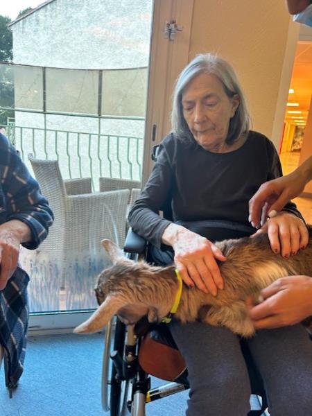 Très vite adoptée par les résidents comme par le personnel, notre “nouveau bébé” bénéficie d’un programme bien organisé : biberons à heures fixes, séances de câlins personnalisées et surveillance rapprochée (principalement pour éviter qu’elle ne goûte les dossiers administratifs).